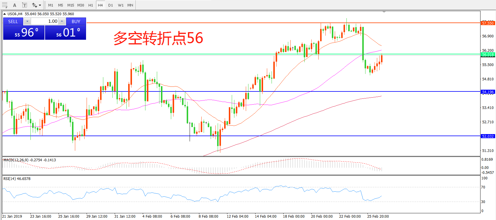 4小时图看,油价昨日小幅反弹,收盘触及多空转折点56美金一线,21均线逐渐下穿,有形成死叉迹象,MACD绿柱减少,RSI拐头向上。存在小幅反弹可能,但整体走势依然偏空。