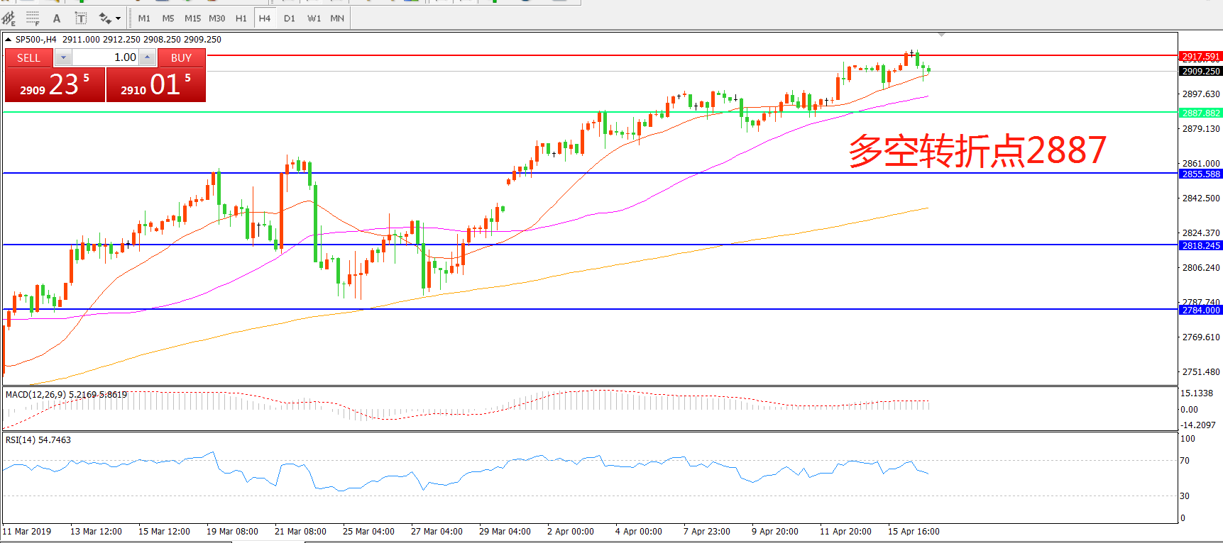 4小时图看,标普500短线突破上方阻力后小幅回落,短期整体走势依然强势,以21均线为依托延续上行成为可能,MACD走平,RSI指标向上,日内依然维持多头思路。