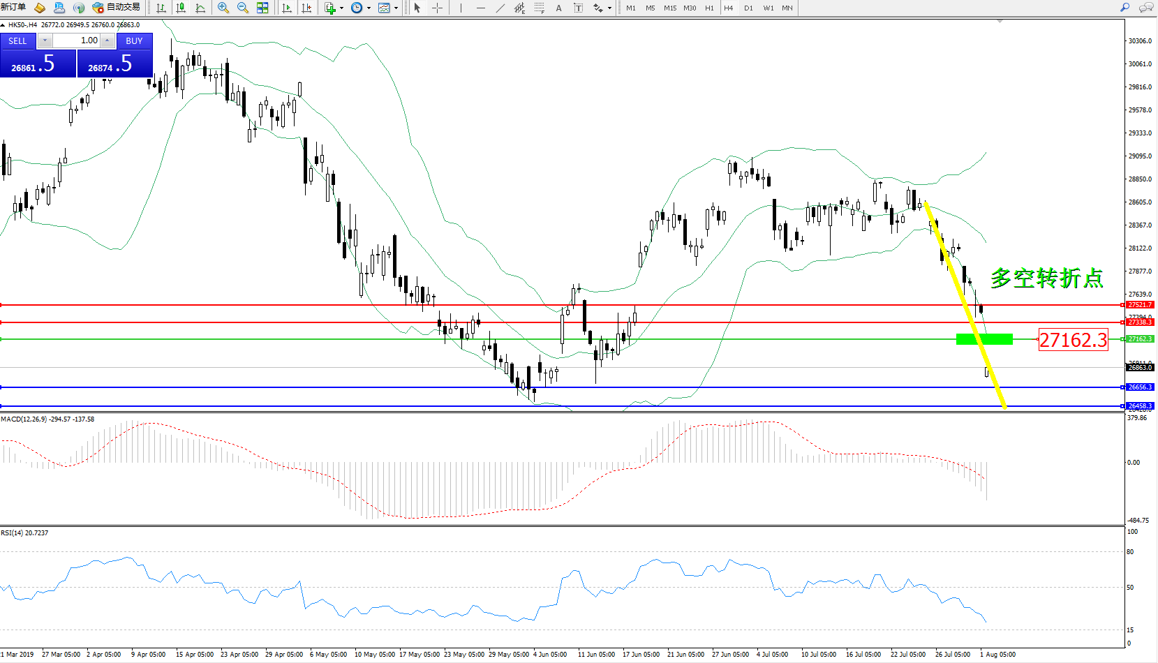 香港恒生指数8月1日(周四)收盘下跌212.05点,跌幅0.76%,报27565.70点; 美联储降息25个基点符合市场预期,为2008年底以来首次降息。香港金管局将基准利率下调25个基点至2.50%。港股恒指低开0.7%,FOMC的声明中并未给出鸽派信号,甚至不少人将鲍威尔的讲话解读为偏鹰。相信恒指短期仍会受压,由于28000-29000点之区间已打破,若短期未能重上28000点水平,走势料会进一步转弱,首个支持位为27500点水平。如跌破的话料会进一步下试27000点附近。这段时间恒指欠缺方向、成交量低迷、投资气氛审慎,市场等待了很久的美联储降息不及早前预期,而磋商也未有实质性进展,对市场信心造成打击。