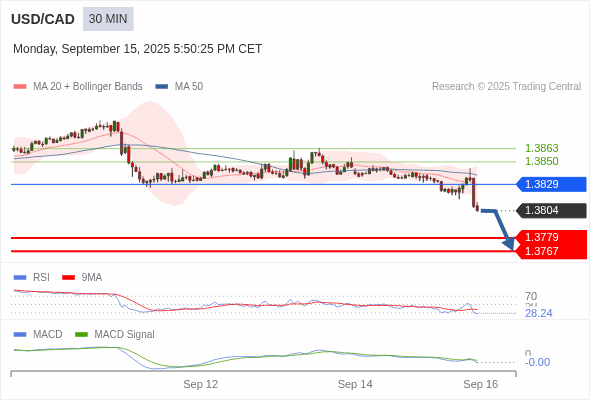 美元/加元 当日内 : 看跌,在 1.3829 之下。