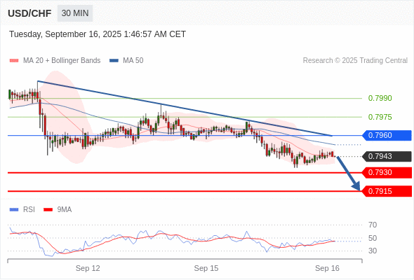 在 0.7960 之下,看跌,目标价位为 0.7930 ,然后为 0.7915 。