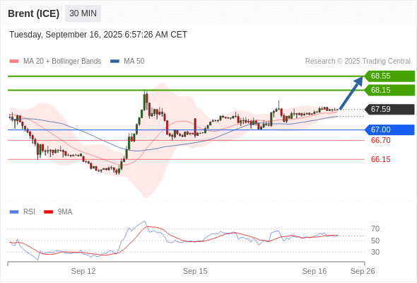布伦特原油 (ICE) (X5) 当日内: 在67.00之上,看涨。
