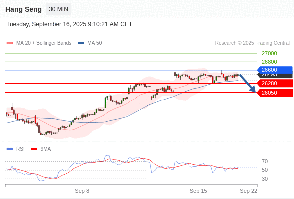 恒生指数 当日内: 短期关键阻力位在26600。