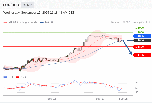 在 1.1865 之下,看跌,目标价位为 1.1820 ,然后为 1.1785 。