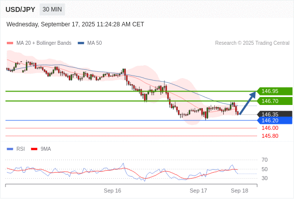 在 146.20 之上,看涨,目标价位为 146.70 ,然后为 146.95 。
