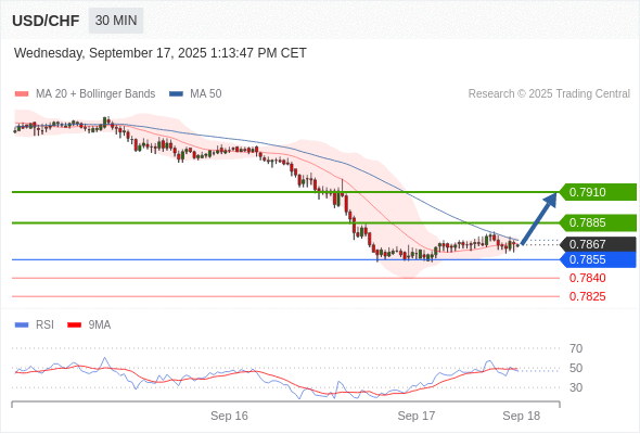 在 0.7855 之上,看涨,目标价位为 0.7885 ,然后为 0.7910 。