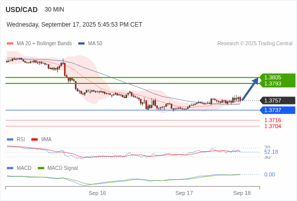 美元/加元 当日内 : 看涨,当 1.3737 为支撑位。