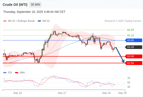 在 63.85 之下,看跌,目标价位为 63.00 ,然后为 62.65 。
