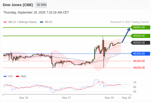 美国道琼斯指数期货 (Z5) 当日内: 目标位为46800.00。