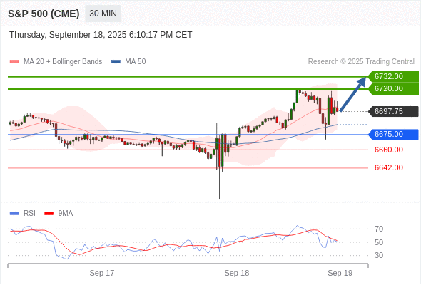 美国标普500指数期货 (Z5) 当日内: 超短线(当日内)支撑位在6675.00附近。