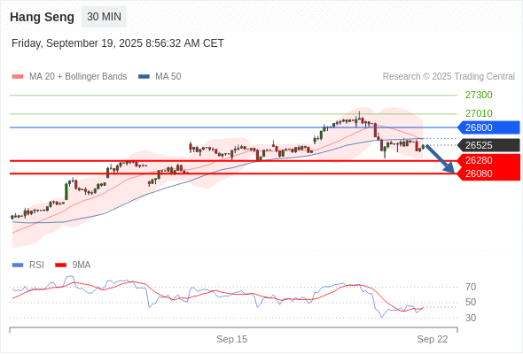 恒生指数 当日内: 调整。