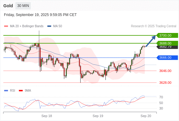 在 3666.00 之上,看涨,目标价位为 3688.00 ,然后为 3700.00 。