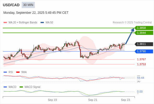 美元/加元 当日内 : 看涨,当 1.3790 为支撑位。