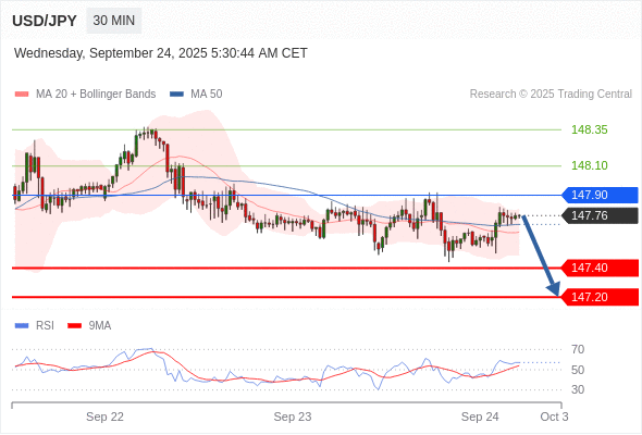 在 147.90 之下,看跌,目标价位为 147.40 ,然后为 147.20 。