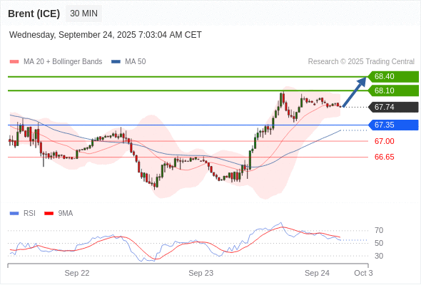 在 67.35 之上,看涨,目标价位为 68.10 ,然后为 68.40 。