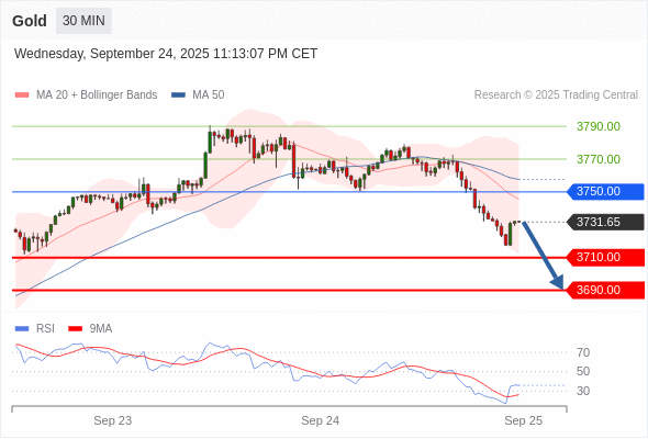在 3750.00 之下,看跌,目标价位为 3710.00 ,然后为 3690.00 。