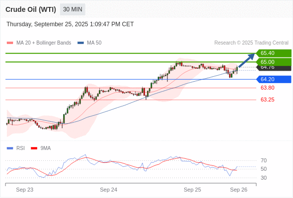 在 64.20 之上,看涨,目标价位为 65.00 ,然后为 65.40 。