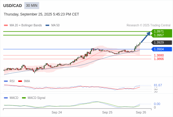 技术点评: RSI技术指标大于70。在这种情况下,说明有很强的上升趋势,或者意味着处在超买的状态下,可能会有向下的调整。我们将观察RSI技术指标是否出现背离现象。 MACD技术指标处在其信号线之上看多。 配置为正。 此外,价位高于其20天及50天移动平均线 ( 分别位于1.3902 和1.3898 )。 最后,价位突破其布林线通道上轨 (位于1.3925。
