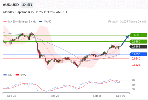 在 0.6550 之上,看涨,目标价位为 0.6580 ,然后为 0.6595 。