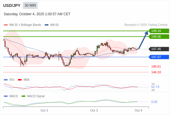美元/日元 当日内 : 看涨,当 147.07 为支撑位。