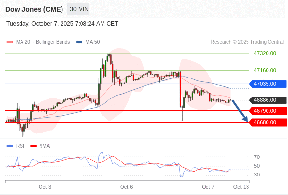 在 47035.00 之下,看跌,目标价位为 46790.00 ,然后为 46680.00 。