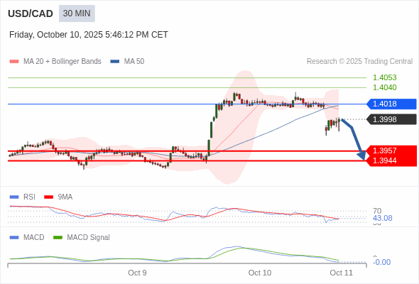 美元/加元 当日内 : 看跌,在 1.4018 之下。