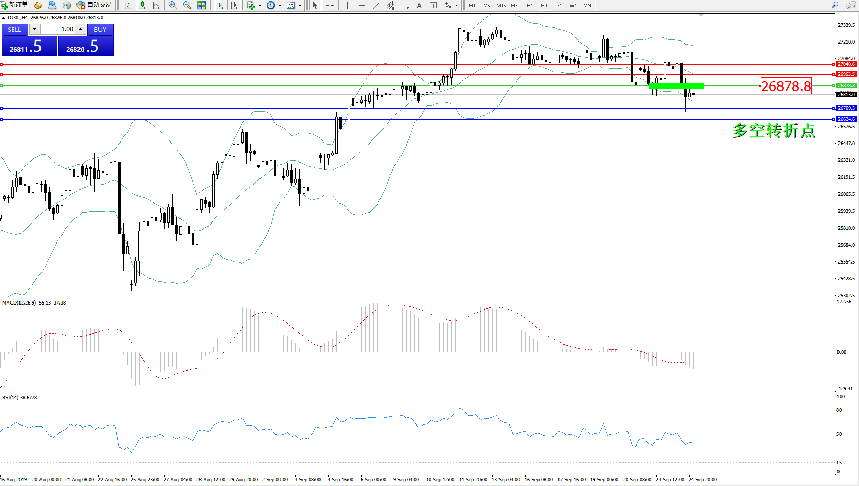 道琼斯指数924日(周二)收盘下跌141.70点,跌幅0.53%,报26808.31点。美国众议院议长佩洛西表示,宣布对特朗普的正式的弹劾调查,受到此消息影响,美股经济数据疲软以及股市走低;中段集体转跌,一度收复部分失地后尾盘再度跌幅扩大。板块方面,金融板块和科技板块领跌。政治不确定性给股市带来的压力,以及美国国债收益率的小幅回落。