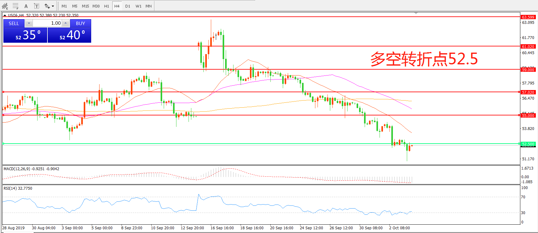 周四(10月3日),美国经济增长放缓以及欧洲经济衰退预期加剧,引发了人们对全球经济可能陷入衰退的担忧。周二公布的报告显示,美国供应管理协会(ISM) 9月制造业指数为47.8,为2009年6月大衰退结束以来最差表现。风险情绪的衰退导致油价表现疲软,美国WTI原油收跌0.4%,报52.33美元/桶。