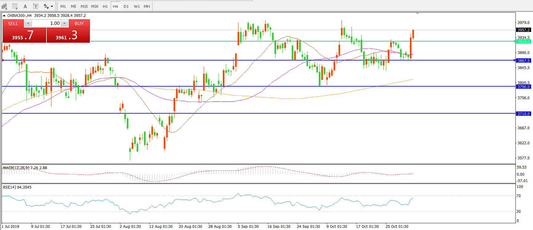 4小时图看,沪深300回踩3867.5之后大幅拉升,整体走势偏强,3985附近阻力近在咫尺,均线系统走平,MACD红柱缩短,RSI指标向平,日内延续上行概率较大。