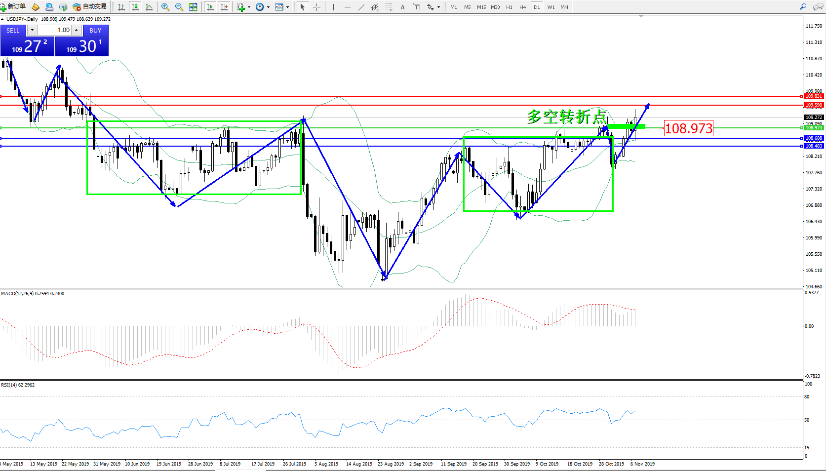 交易策略:108.973上方看涨,目标109.590、109.831