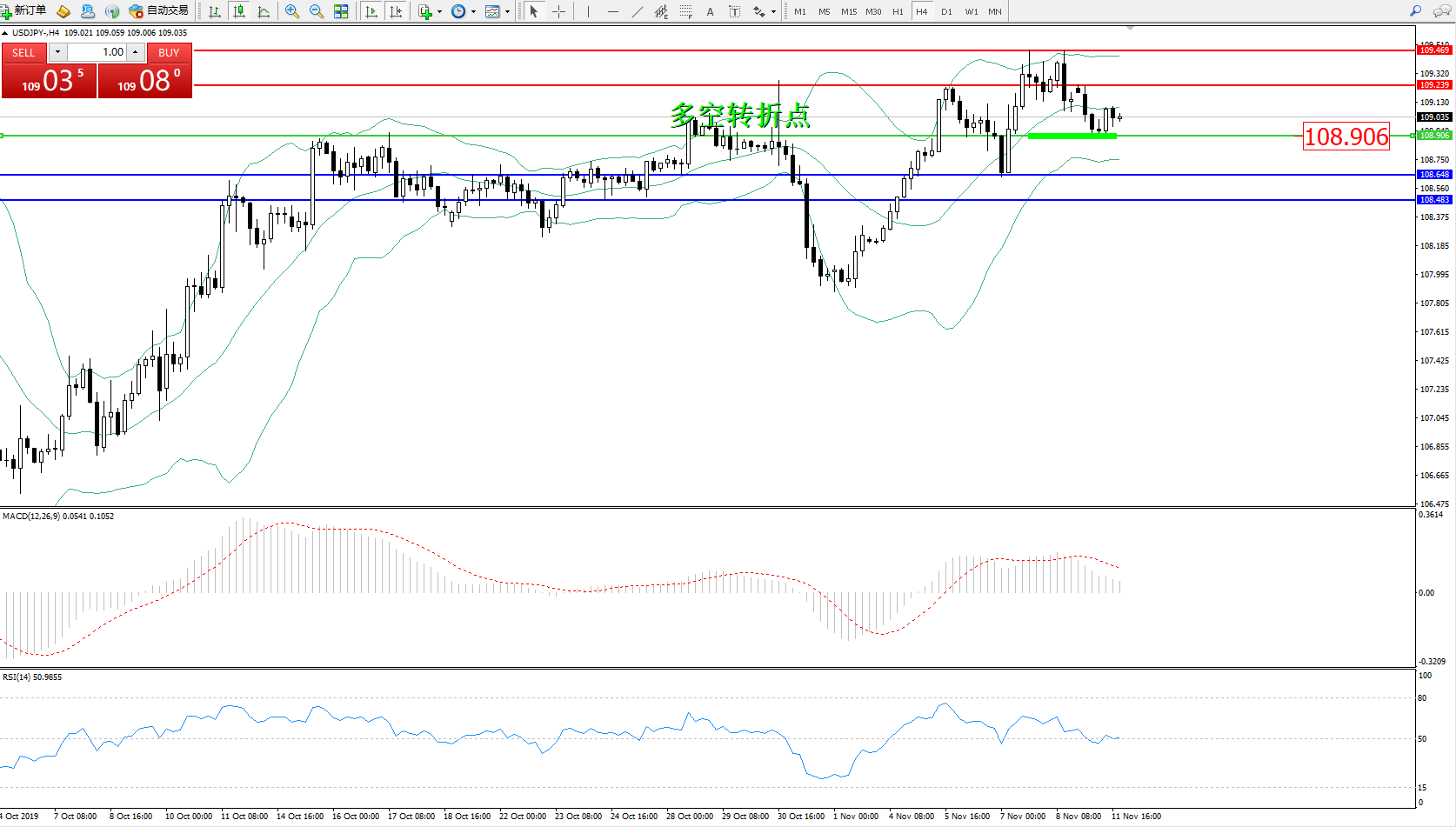 交易策略:108.906上方看涨,目标109.239、109.469