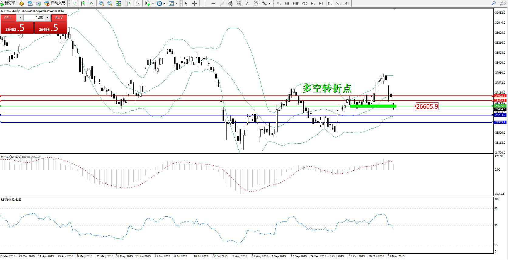 香港恒生指数11月13日(周三)收盘下跌493.82点,跌幅1.82%,报26571.46点;港股4天大跌1300点 空头力量增180%!千亿“南水”力撑 香港最大ETF也有动作,教育,其他支援服务,家庭电器,重型基建,软件开发等5个板块跌幅居前,蓝筹股走弱拖累恒指跌超500点,香港特区政府公布今年第三季度经济数据:GDP总值较上年同期下跌2.9%,为2009年国际金融危机以来最大跌幅,今年经济大概率将出现负增长。第二季度下跌0.5%,第三季度跌幅扩大到3.2%,连续两个季度下跌,已符合技术性衰退特征。来自香港金管局的数据显示,除了政府开支,各项数据都在下滑。其中服务输出大幅下滑13.7%。