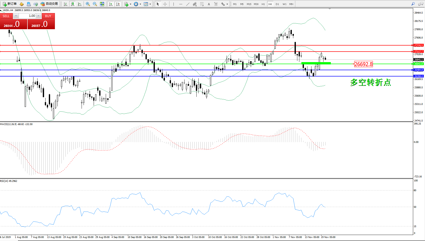 香港恒生指数11月20日(周三)收盘下跌204.19点,跌幅0.75%,报26889.61点;恒生指数早间跌至26605.63点后止跌震荡,午后跟随内地A股升幅扩大,盘中稳步上升,蓝筹方面几乎全线收涨,手机零件股板块造好,瑞声、舜宇升幅位居蓝筹榜,医药、香港地产股升幅亦靠前。相反,石油、博彩板块表现不一,个别个股小幅走低。回顾恒指周二低开高走,重拾120日线,收市报27093.80点,上涨1.55%,成交额约799.06亿港元。港交所20日宣布,将于11月26日阿里巴巴上市时,推出阿里巴巴期货、期权及相关的衍生权证。阿里巴巴也将于同日纳入可进行卖空的指定证券名单。