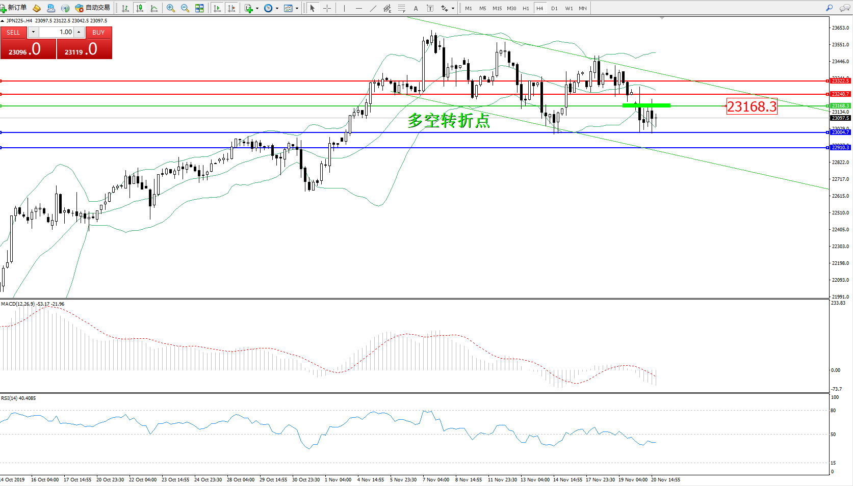 日经225指数11月20日(周三)收盘下跌155.65点,跌幅0.67%,报23137.00点。日本经济再生大臣西村康稔:首相安倍晋三指示使刺激计划规模化,支持无线5G将成为国家项目,税收政策应该支持初创企业和并购企业,希望日本企业使用现金储备投资,国内需求稳定,但消费税上调影响消费者,想要对当地小型企业提供支持,关注制造商减少招聘,全球经济影响日本的产出、出口和就业,贸易因素重压全球需求,从而影响日本生产,对经济正在复苏的看法没有改变,希望更多国家能加入跨太平洋伙伴关系协定(TPP),包括美国,希望英国在离开欧盟后可以加入跨太平洋伙伴关系协定。