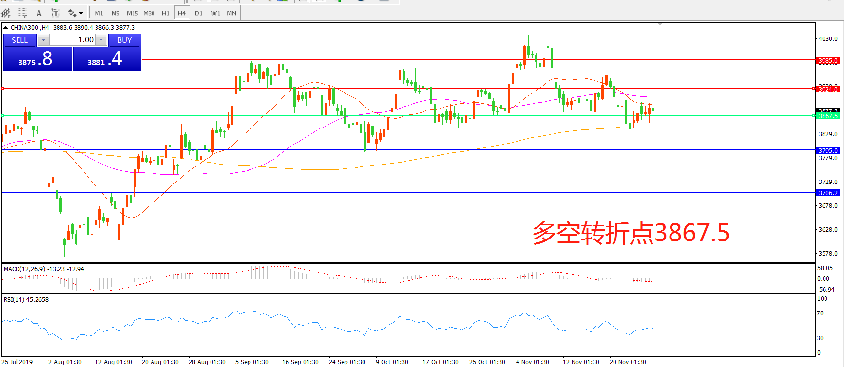 4小时图看,沪深300延续低位震荡,200周期均线成为短期支撑,中期均线成为上方阻力,MACD红柱增加,RSI指标向上,日内维持震荡概率较大。