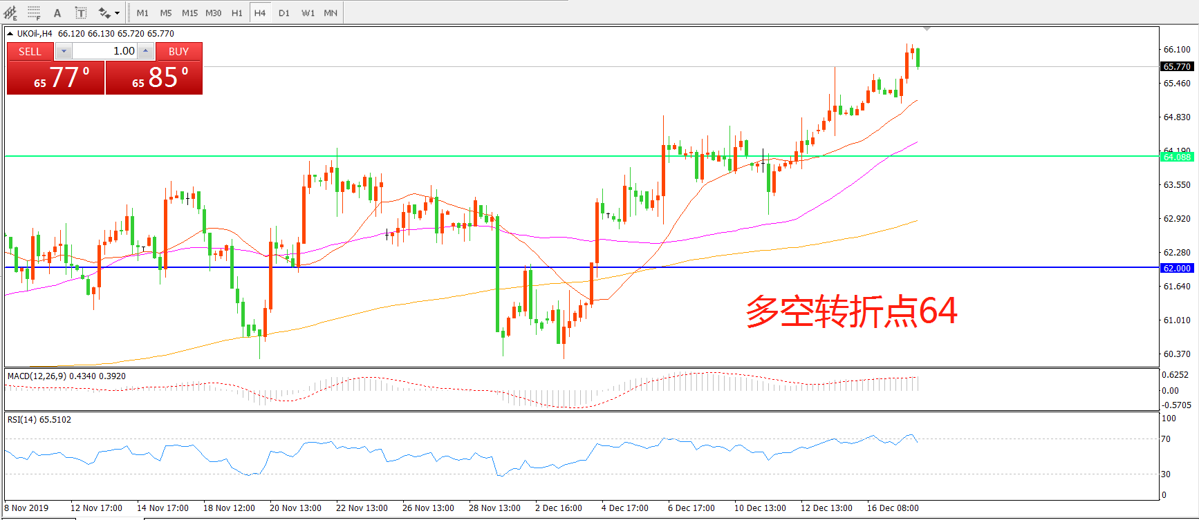 4小时图看,油价连续反弹,整体走势偏强,64美元被突破后,有加速上行的趋势,均线系统呈多头排列,MACD红柱增加,RSI指标走平,日内延续上行概率较大。