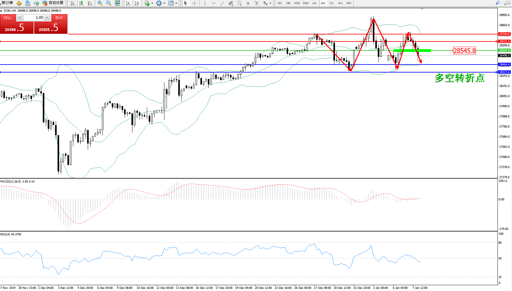 技术点评:波幅空间逐渐收窄,且布林带指标处于收口走势中,再次跌破布林指标中轨下方震荡,MACD指标纠结于0轴线附近弱势整理中 ,RSI指标处于50均衡线下方弱势向下移动中;