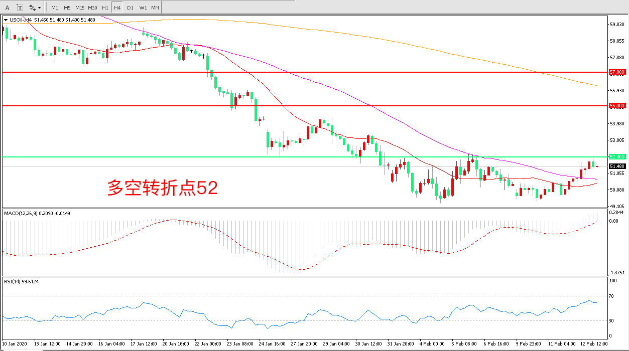 4小时图看,油价探底回升整体走势有回暖迹象52美元成为短期阻力,均线系统走平MACD红柱增加RSI指标向上,日内延续上行概率较大