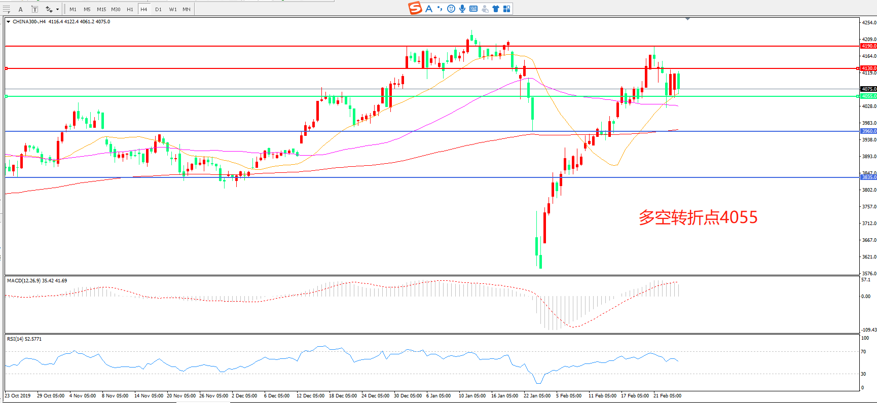4小时图看,沪深300延续区间震荡,4130成为上方阻力,短期均线走平,MACD红柱减少,RSI指标走平,日内延续震荡概率较大。