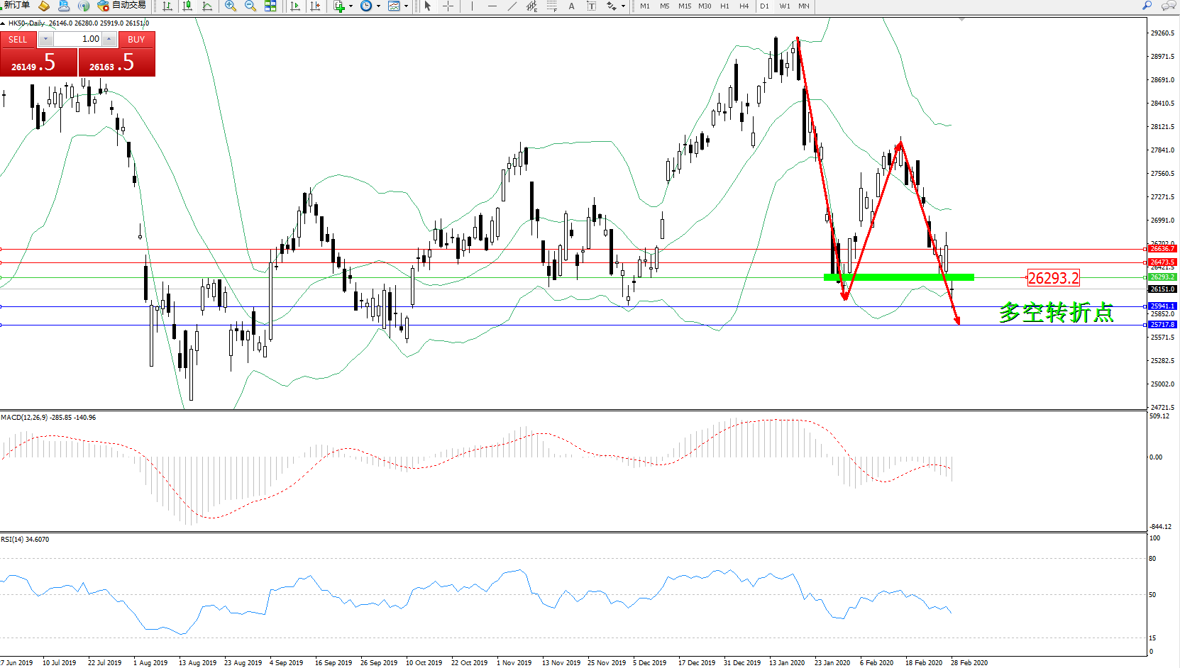 香港恒生指数2月28日(周五)收盘下跌648.69点,跌幅2.42%,报26129.93点;恒指低开低走,26000点一度失守,午后恒指窄幅震荡。新冠肺炎疫情继续在海外扩散,担忧国际经济受压,致使全球股市集体大跌。亚太股市收盘全线大跌。港股主要股指全日低迷,大幅低开后盘中持续羸弱。行业板块近乎全线下跌,蓝筹权重股集体下泄。肺炎疫情给股票市场带来恐慌加剧。主板成交量放大至1681.93亿港元,港股通净流入46.9亿港元。目前港股估值在全球市场范围属于低估值洼地区域,纵向来看港股估值处历史低位,长期投资价值依然非常高。随着疫情得到有效抑制,同时有托底政策持续加码,再叠加外资、银行理财、保险养老金等中长期资金持续流入,市场将很快重新进入上行轨道。
