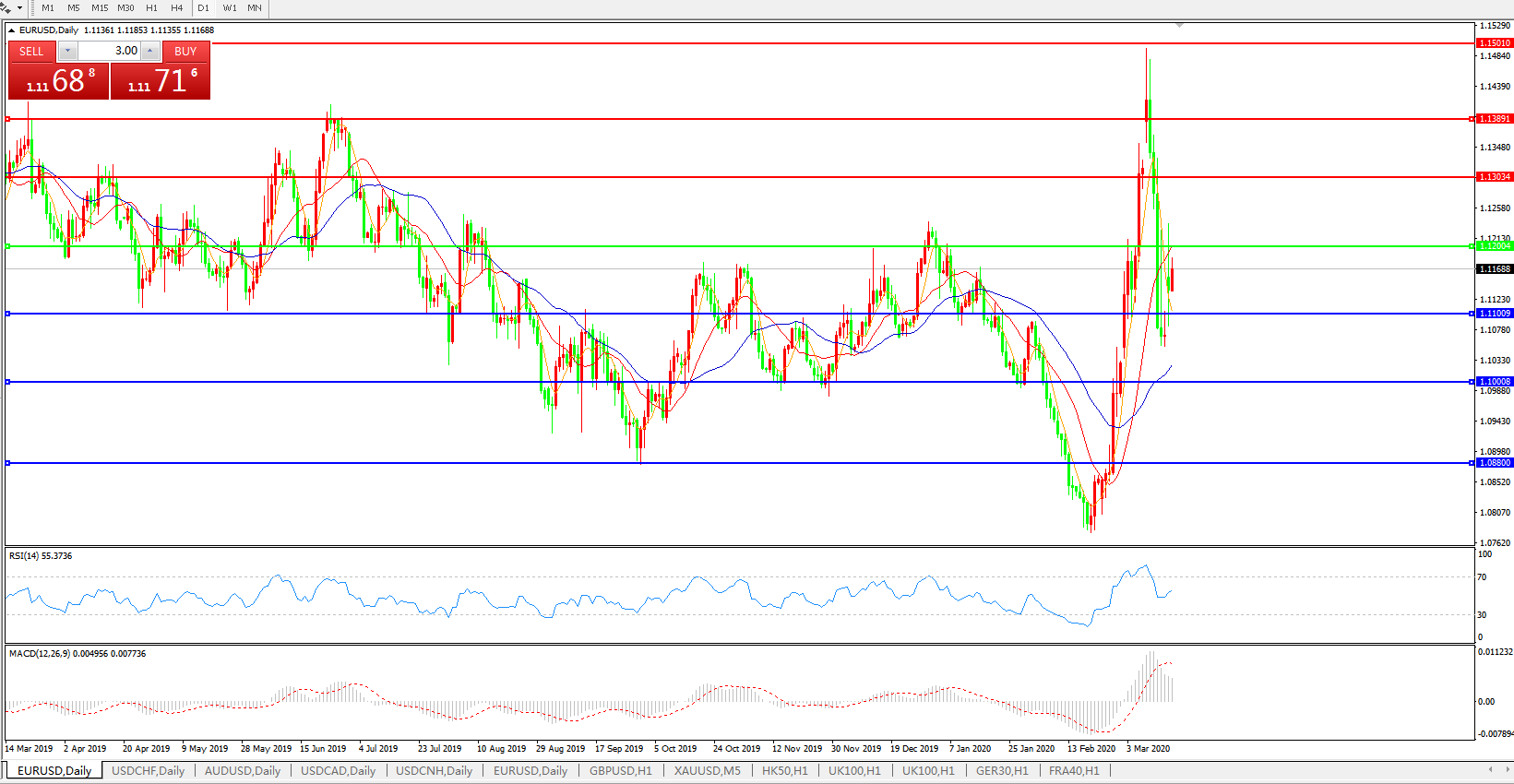 欧元兑美元反弹后劲不足,短线关注1.1100关口支撑