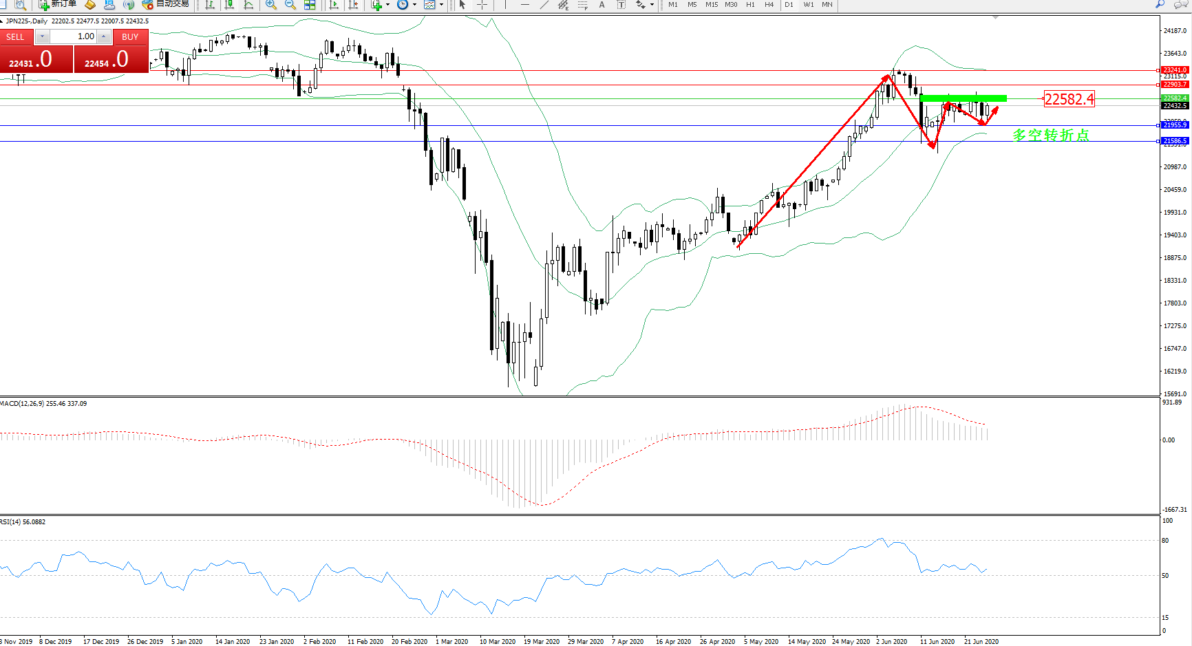 日经225指数6月25日(周四)收盘下跌264.82点,跌幅1.18%,报22269.50点。日本央行:截至3月底,日本央行持有44.2%的日本政府债券。外资持有日本政府债券的比例为12.9%。据日本时事通讯社:东京今日新增48例新冠肺炎确诊病例。日内尽管避险情绪升温,但在二次疫情压力上升的背景下,投资者依旧青睐美元,风险资产普遍承压,流动性风险担忧可能再度回归。美股三大股指周三录得近两周来最大单日百分比跌幅,因美国冠状病毒病例激增加剧了市场对政府实施新一轮封锁和经济损失加重的担忧。纳斯达克指数结束了此前连涨八天的走势,这是自2019年12月以来的持续时间最长的升势,从周二本月第五次刷新的收盘纪录高位回落。