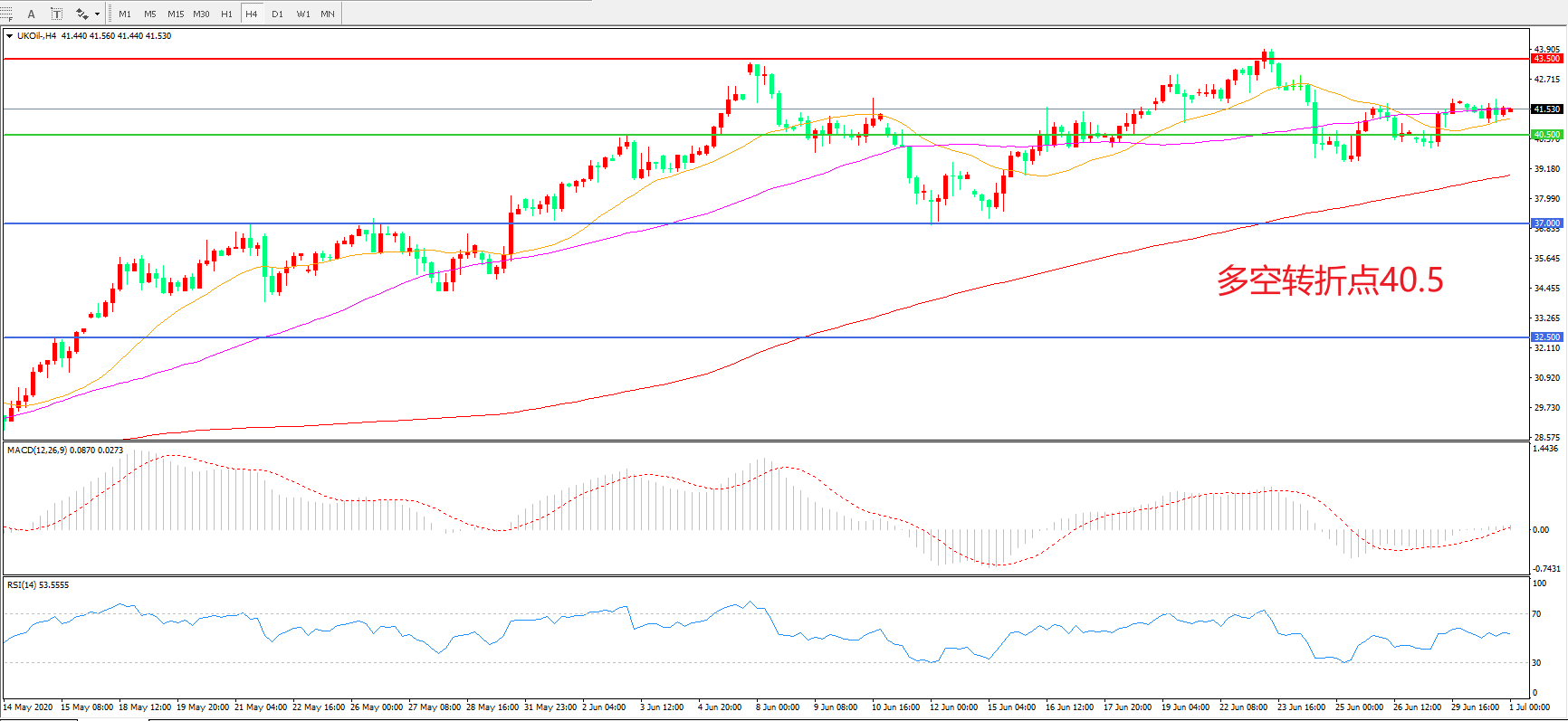 4小时图看,油价维持高位震荡,波幅不大,40.50成为短期支撑,MACD绿柱减少,RSI指标走平,日内延续震荡概率较大。