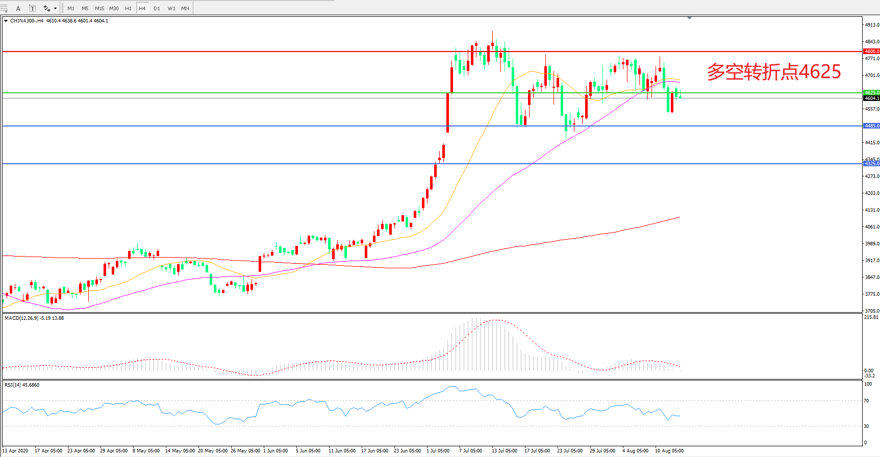4小时图看,沪深300长阴下破后延续窄幅震荡,短期走势低迷,4625成为短期阻力,均线系统走平, MACD红柱缩短,RSI指标走平,日内延续震荡概率较大。