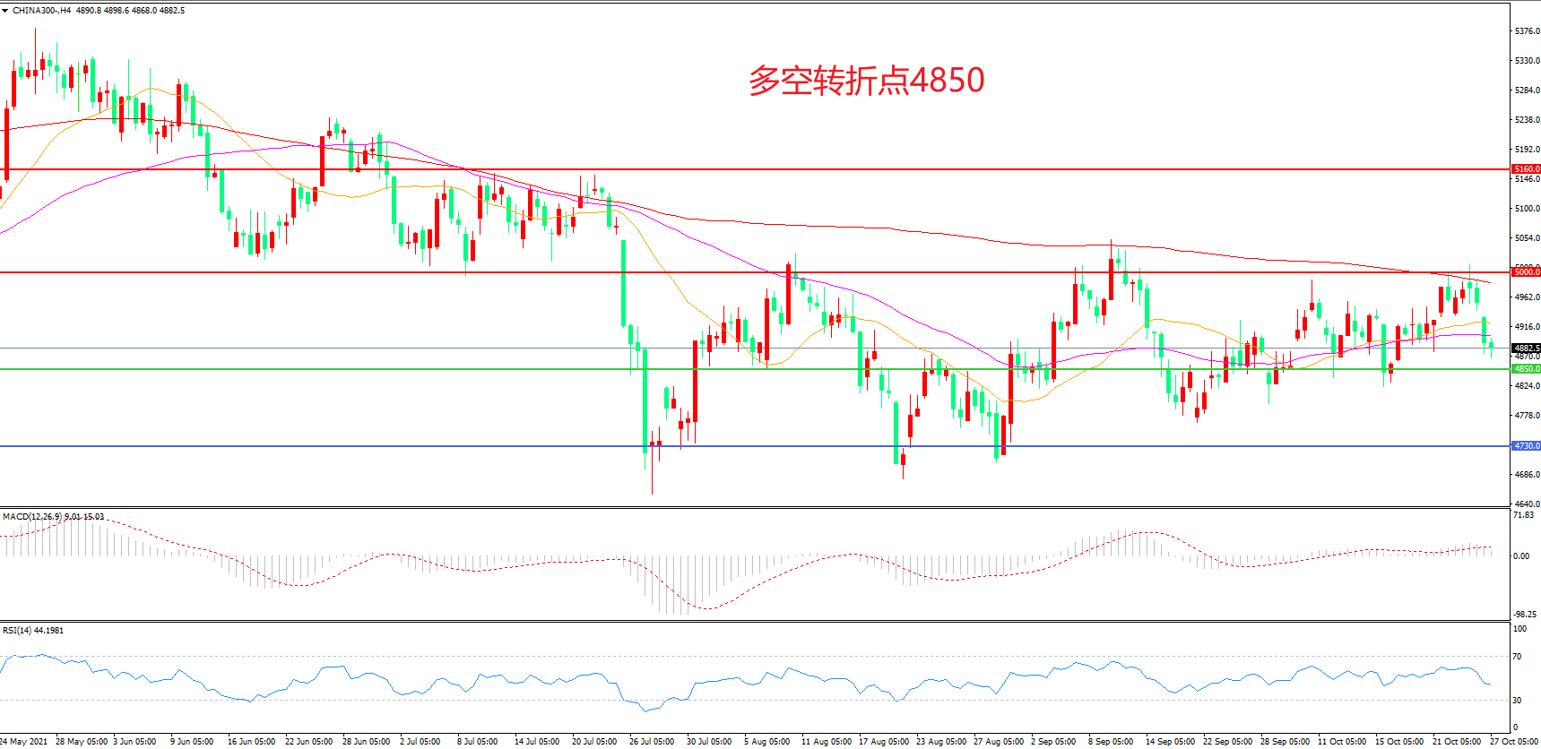 4小时图看,沪深300低开低走,大幅回落,区间震荡迹象明显 ,4850成为短线支撑,200周期均线成为上方阻力,MACD红柱减少,RSI指标走平,日内延续震荡概率较大。