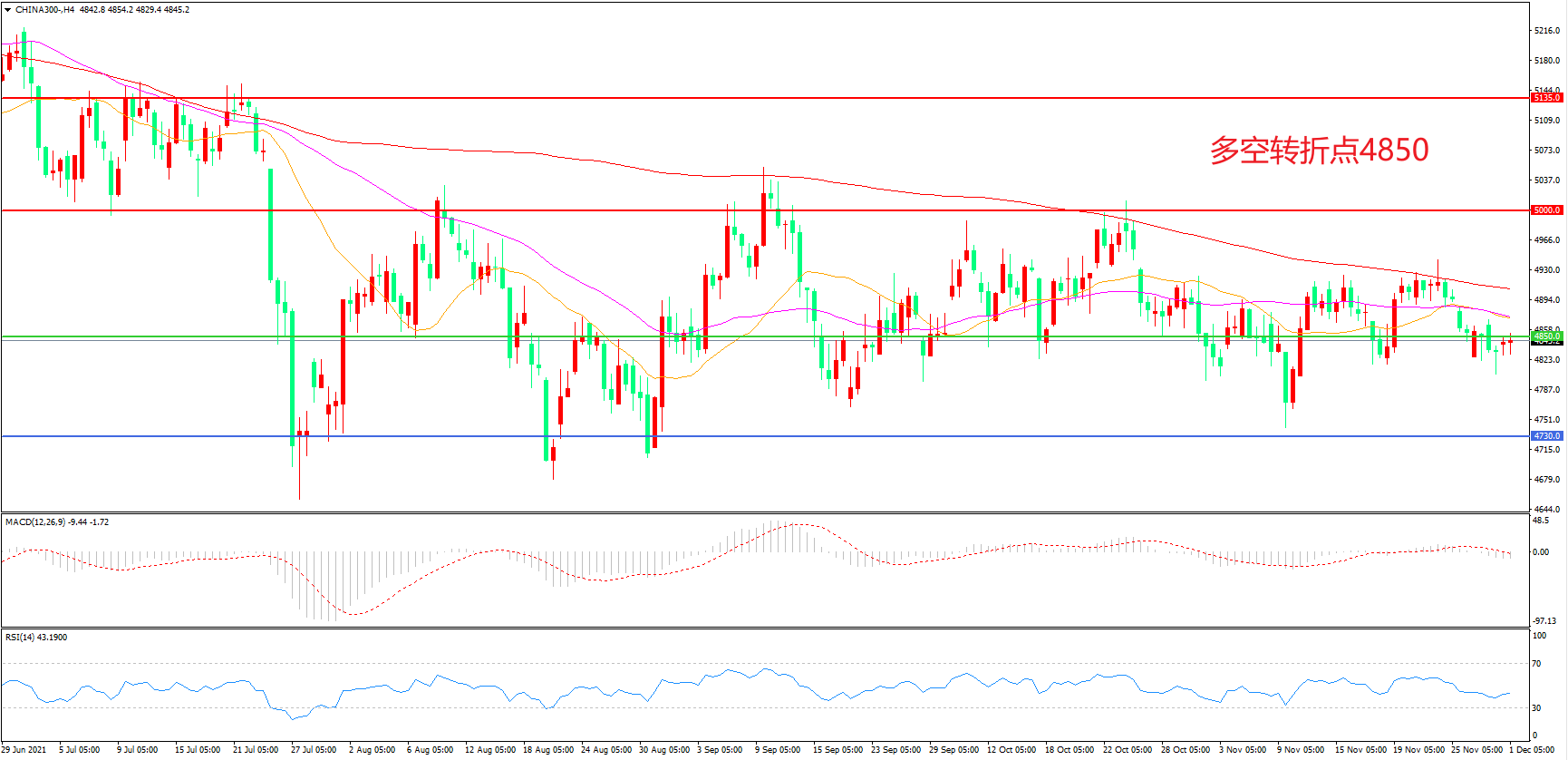 4小时图看,沪深300延续窄幅震荡,整体波幅不大,均线系统呈空头排列,4850成为多空分水岭,MACD绿柱增加,RSI指标走平,日内延续震荡概率较大。