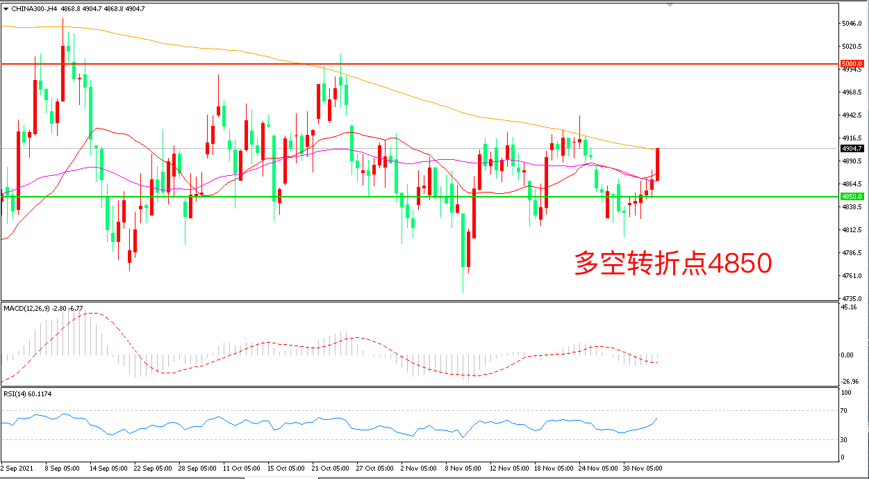 4小时图看,沪深300自低位长阳拉升,短期表现回暖,200均线成为短期阻力,4850成为多空分水岭,MACD红柱增加,RSI指标向上,日内震荡上行概率较大。