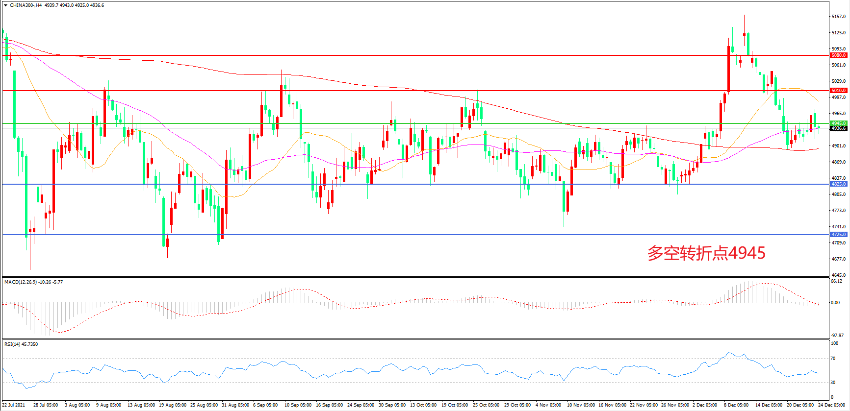 4小时图看,沪深300小幅反弹后再度回来,弱势震荡迹象明显,形态上看空头趋势暂时未改,4945成为多空分水岭, MACD绿柱缩短,RSI指标走平,日内延续震荡概率较大。