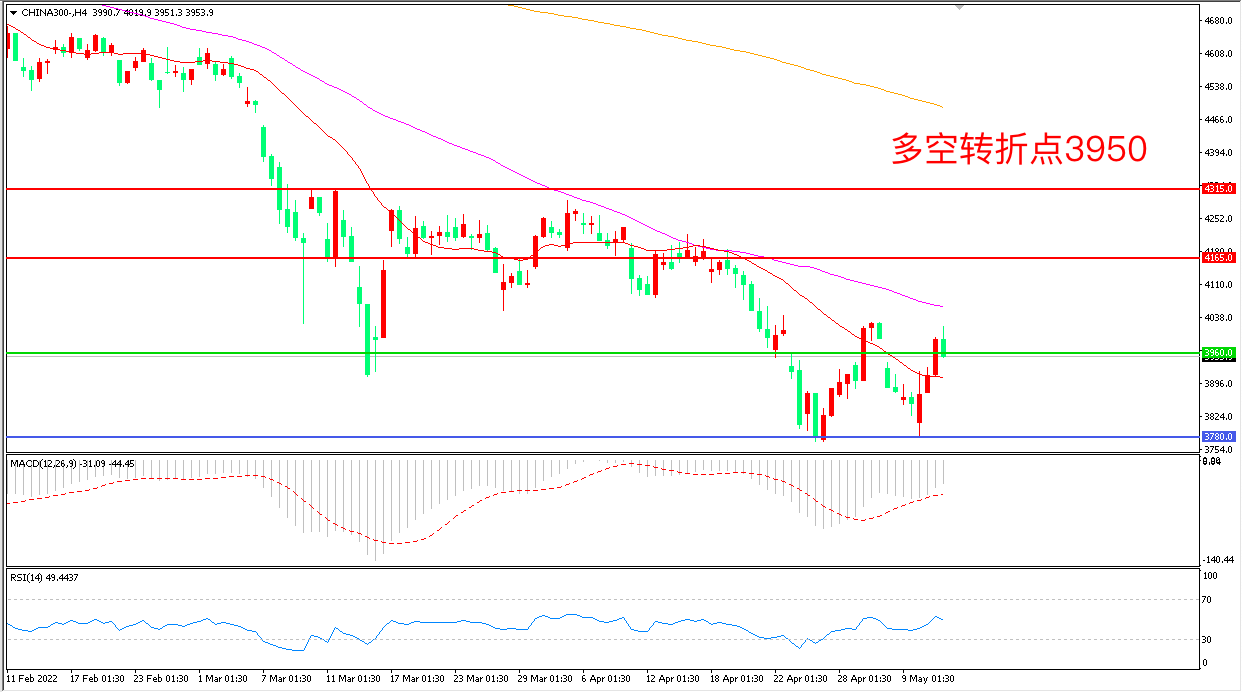 4小时图看,沪深300连续拉升,短线走势回暖,均线系统走平,3950成为多空分水岭,MACD绿柱缩短,RSI指标走平,日内小幅反弹概率较大。