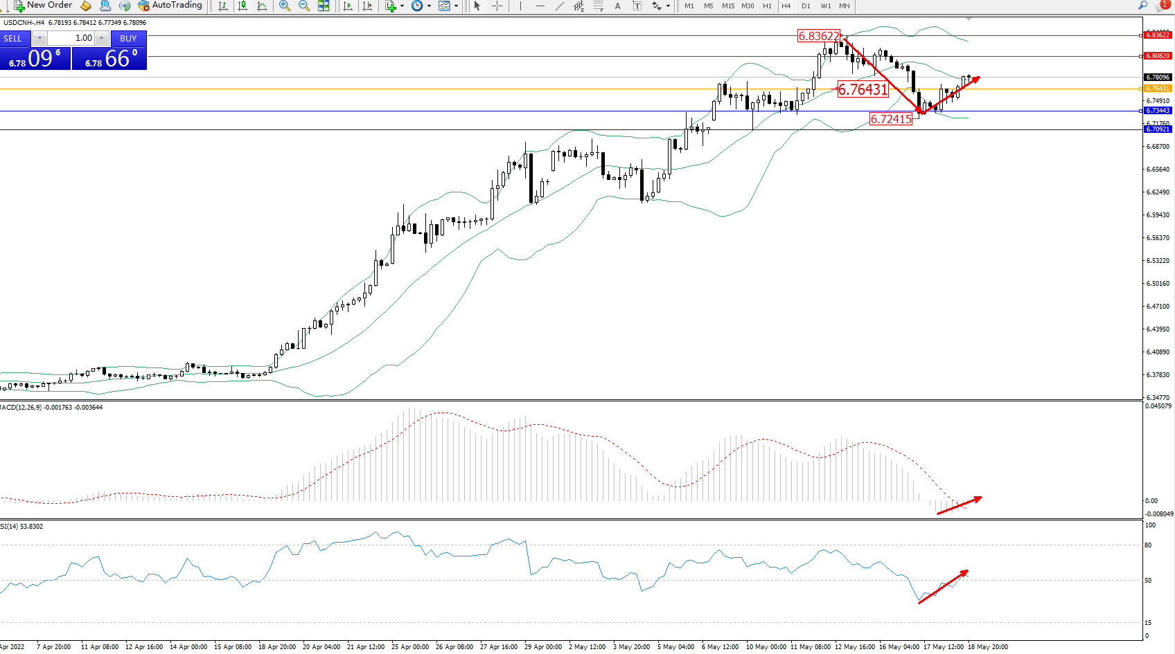 交易策略:6.76431上方看涨,目标6.80820、6.83622